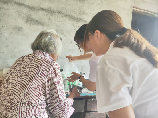 在村干部李主任的带领下,志愿者拜访了村内一位高龄老人的家。志愿者仔细询问了老人的基本情况,并送上了精心准备的慰问品。志愿者如同希望的火炬手,通过一场跨时代的对话向空巢老人传递了社会的关注与爱护。随后,志愿者来到了幸福里食堂,协助食堂工作人员为老人们准备午饭,发放慰问品。