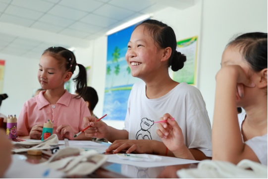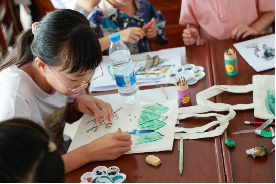 在曹武村的活动室内,志愿者为孩子们精心准备了一堂绘画课,用颜料在画布上绘出最美家乡。孩子们充满好奇心,先在白纸上构思,然后在帆布上尽情挥洒自己的灵感与创意。山水轮廓、草屋炊烟、沃野千里。一幅幅色彩斑斓的作品,不仅展现了孩子们丰富的想象力和创造力,更成为了曹武镇乡村美景的生动写照。