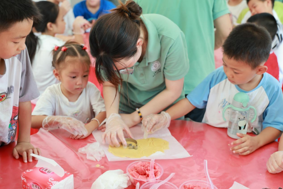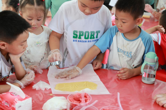 接下来,烘焙课程正式开始。一部分孩子围在桌边,手持擀面杖,小心翼翼地压平面团,再用精心挑选的模具轻轻一按,一个个形态各异、憨态可掬的小饼干便诞生了。他们的脸上洋溢着专注与喜悦,仿佛在完成一件艺术品。而另一边,其他孩子则忙着将蛋挞液倒入蛋挞皮中,再巧妙地加入蓝莓酱作为点缀,更有甚者,创新地将饼干、奶油用作蛋挞的装饰。
