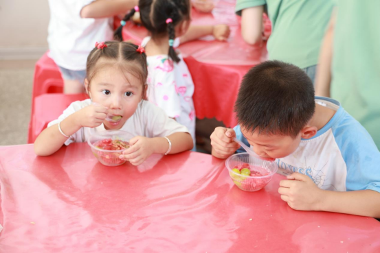 在简单地讲解了烘焙的常识及注意事项后,孩子们在志愿者的带领下来到了曹武村爱心食堂进行烘焙实践活动。桌子上,饱满多汁的水果早已被细心切好,作为冰粉的材料整齐地摆放在桌子中央。看到这一幕,孩子们的眼睛瞬间亮了起来,他们迫不及待地找到自己的位置坐下,乖巧地等待志愿者的安排。