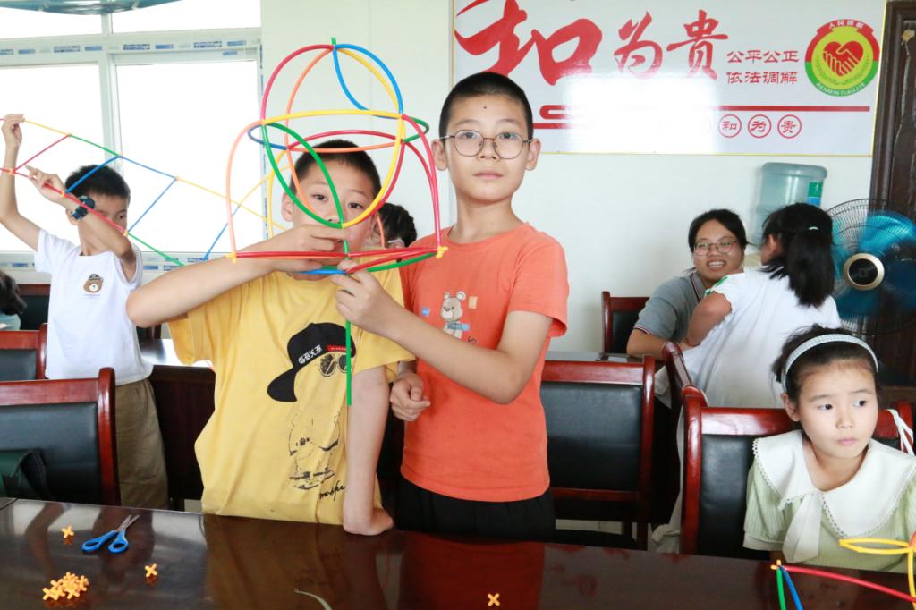 两个孩子默契配合搭建“火箭”,他们将吸管层层嵌套堆叠成箭身,细心搭出棱角分明的尾翼。当作品完工时,孩子们高高举起“火箭”展示,随后拉着它欢快奔跑,身影与手中的“火箭”宛如一道划破天际的流光。这灵动一幕引得众人纷纷鼓掌赞叹:“瞧!真要直上云霄啦!”