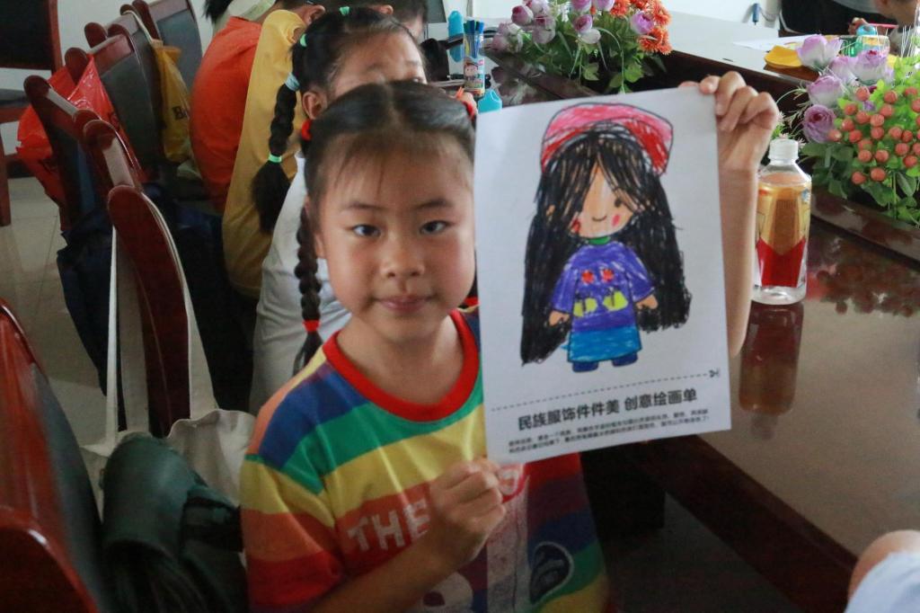 “原来56个民族56支花,56个民族都是一朵不一样的花呀!”在志愿者引领下,孩子们通过高清照片和趣味小故事,了解认识到了各少数民族服饰的独特魅力:蒙古族服饰的长袍腰带尽显豪迈,刺绣纹样藏着草原的辽阔;傣族服饰的筒裙轻盈飘逸,银饰叮咚仿佛能听见泼水节的欢歌;维吾尔族服饰的彩色刺绣绚丽夺目,每一针线都透着浓郁的民族风情……孩子们听得入了迷,不时发出“哇”的赞叹,眼中闪烁着对少数民族文化的向往。“老师,苗族的银饰好漂亮呀!我也想试穿。”“傣族的筒裙我也想有一条!”于是,志愿者们分发印有模特小人的纸张和彩笔,“那我们假设纸张里的小人就是你,来给这个小人穿上你最喜欢的民族服饰吧!”鼓励孩子们画出自己最喜欢的民族服饰。孩子们拿起画笔,有的模仿着记忆中的蒙古族长袍,认真勾勒衣襟上的云纹;有的偏爱傣族筒裙,用明亮的色彩涂抹出裙摆的飘逸;还有的发挥想象,给小人穿上了融合多种元素的“创意民族装”。笔尖划过纸张的沙沙声里,一件件充满童趣的民族服饰跃然纸上,孩子们在绘画欢乐中感受“中华民族一家亲”的温暖,让民族团结的意识在他们心中生根发芽。